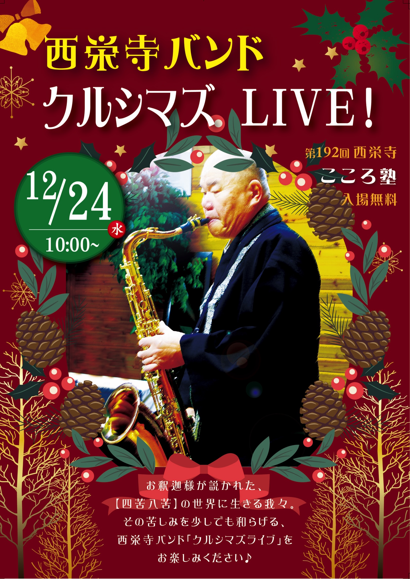 【2025年12月24日】第192回 こころ塾 2026 1/18 こころ塾 公演・ライブ情報 2026年1月18日 12月のこころ塾は!?お釈迦様が説かれた、「四苦八苦」の世界に生きる我々。その苦しみを少しでも和らげる、西栄寺バンド「クルシマズライブ」をお楽しみください♪ 開催場所 大本山大阪本坊 開催日時 2025年12月24日(水)10時スタート こころ塾 公演・ライブ情報 2025 お知り合いにも知らせましょう URLをコピーしました! 西栄寺だより No.141 2026 永代経法要 【2026年1月28日開催】第194回 こころ塾